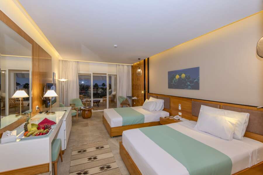In mehreren 2-stöckigen Gebäuden verteilen sich die 220 großzügig und modern eingerichteten Zimmer über die gesamte Anlage. Zur komfortablen Ausstattung gehören individuell verstellbare Klimaanlage, TV, Telefon, Minibar, Safe, Badezimmer mit Bad/Dusche und separatem WC, Haartrockner sowie eine private Terrasse oder Balkon.