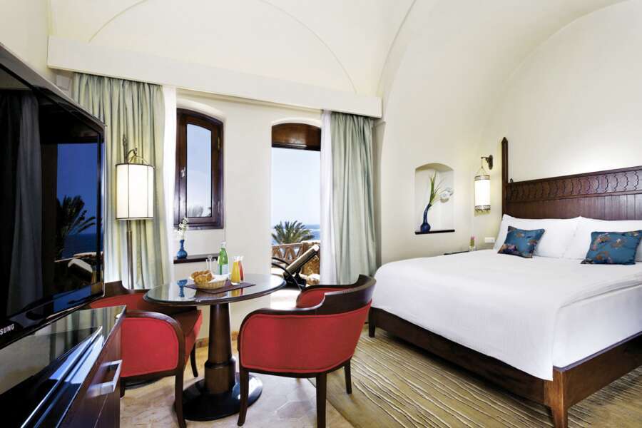 Die 250 Zimmer und Suiten sind in im nubischen Stil gebaut und in verschiedenen Bungalow Gruppen aus rötlichem Sandstein untergebracht. Alle Zimmer haben Sicht aufs Meer oder Blick auf den Garten.
