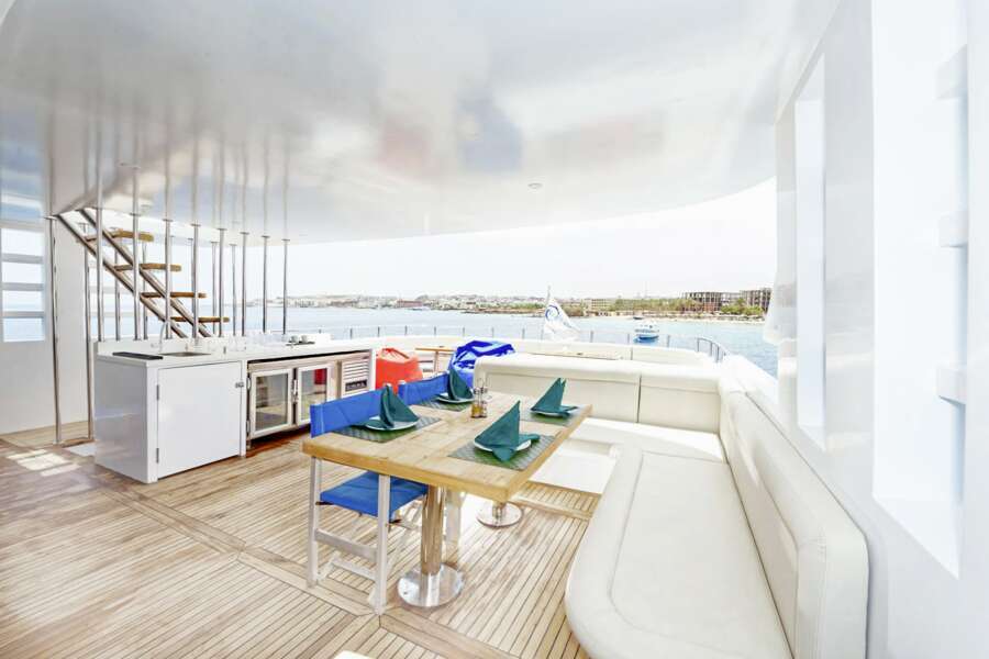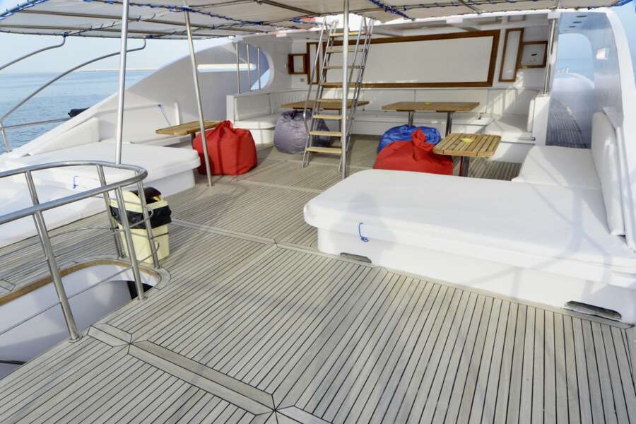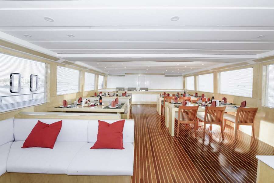 Klimatisierter Wohn- und Essbereich  mit TV, DVD und CD-Player, 2 Sonnendecks, Tauchplattform mit einer Ladestation für Kamera-Akkus und Lampen, kostenloses Wi-Fi solange in der Nähe des Hafens.