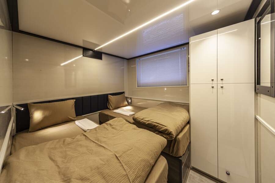 2 Oberdeck- und 2 Hauptdeck Kabinen mit Doppelbett, 2 Zweibettkabinen im Hauptdeck, 3 Zweibettkabinen im Unterdeck und 2 Zweibettkabinen im Unterdeck, die mit zusätzlichem drittem Bett ausgestattet sind.