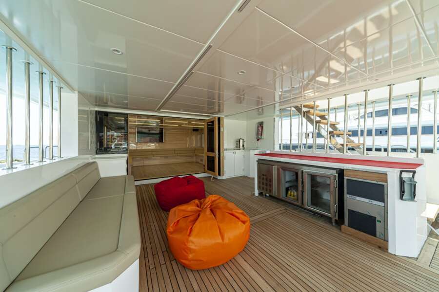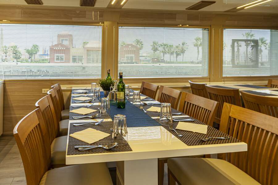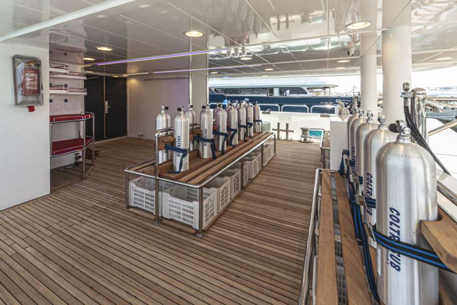 Klimatisierter Wohn- und Essbereich mit TV, 2 Sonnendecks, Tauchplattform mit einer Ladestation für Kamera-Akkus und Lampen, kostenloses WiFi (nur in Hafennähe).