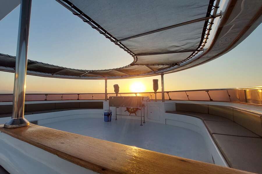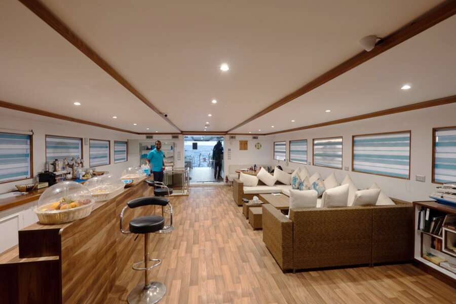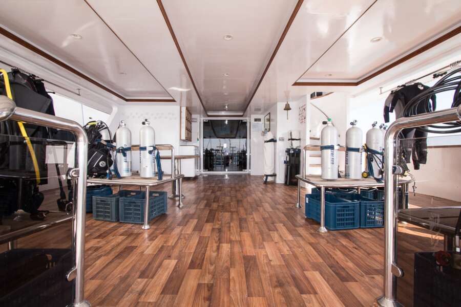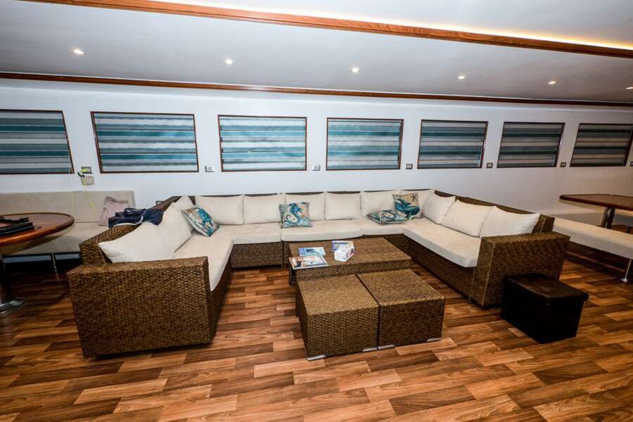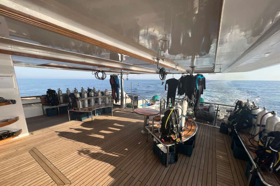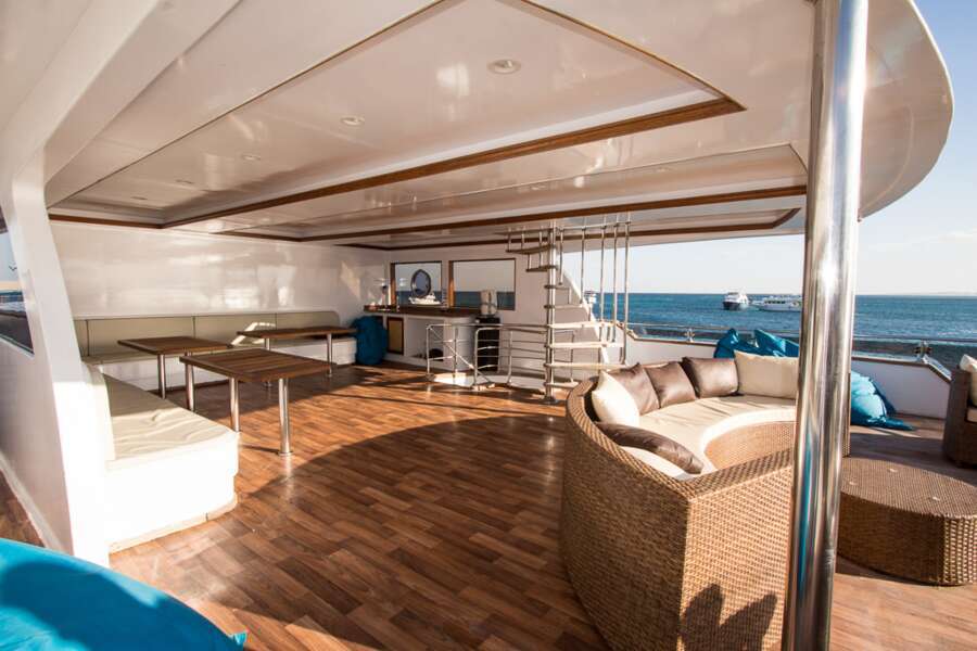 Das große Sonnendeck ist windgeschützt und bietet sich zum Entspannen an, bietet aber auch die Möglichkeit, dass die Mahlzeiten draußen eingenommen werden können. An Bord gibt es genügend Schattenplätze mit Sitz- und Liegeflächen sodass sich die Gäste verteilen können. Auf der Tauchplattform hat jeder Gast seinen Platz mit Stauraum für Equipment. Technikfreaks und Fotografen freuen sich über den großen Fototisch.