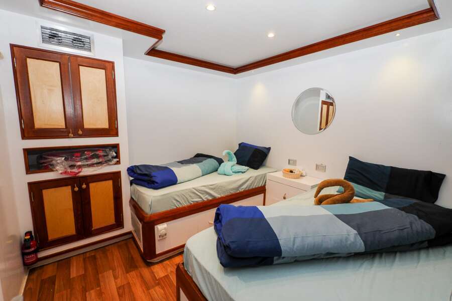 10 Doppelkabinen mit Einzel- und Doppelbetten (6 Kabinen im Unterdeck und 4 Kabinen auf dem Sonnendeck). Jede Kabine hat ein eigenes WC mit Dusche und individuell regulierbarer Klimaanlage.