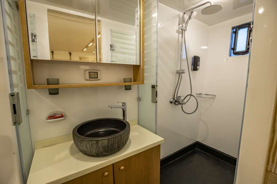 Auf dem Hauptdeck befinden sich neben den Gästekabinen die große Tauchplattform mit Duschen, WC und Fotobereich.