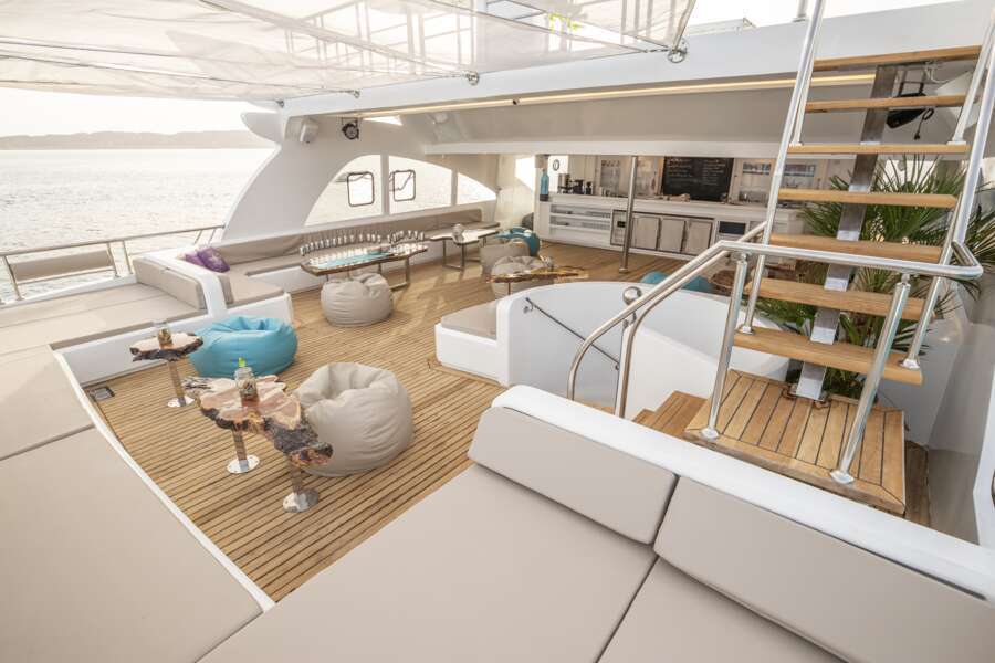 Im hinteren Teil des Oberdecks lädt die Outdoor Lounge mit gemütlichen Sitzmöglichkeiten sowie Sonnenliegen zum entspannen ein. Weitere Liegen befinden sich darüber im Highdeck und Flydeck. Sogar ein Whirlpool darf nicht fehlen, welches auf dem obersten Deck, dem Flydeck, zu finden ist.