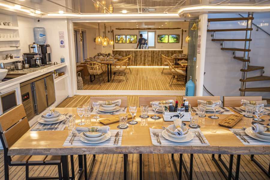 Der Essbereich auf dem Oberdeck bietet während den während den Mahlzeiten stets eine herrliche Aussicht auf das Meer.
