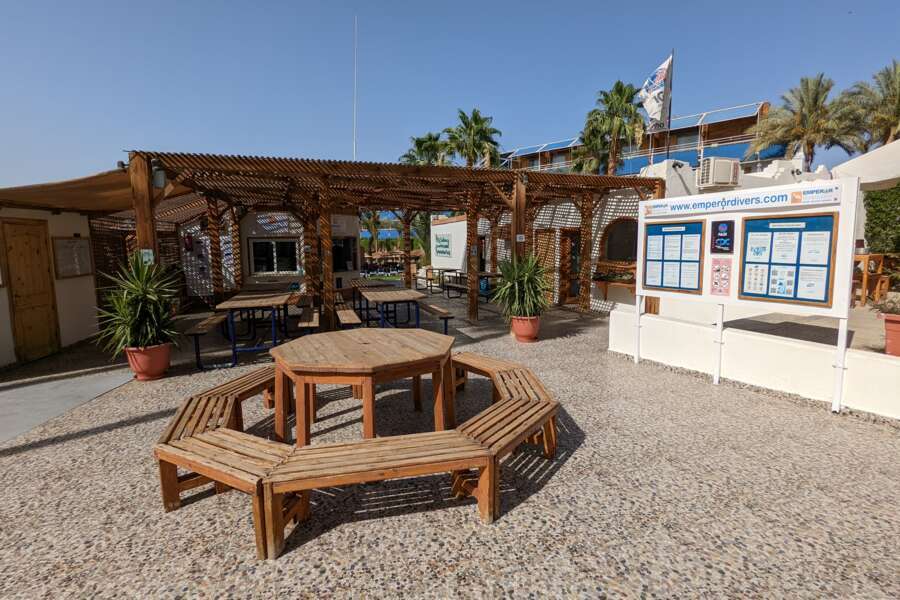Tauchbetrieb Ganztagestrips per Tagesboot (2-3 Tauchgänge) von der 2 Gehminuten entfernten Marina. Die Fahrzeit zu den Tauchplätzen beträgt zwischen 5 Minuten und zwei Stunden. Bei ausreichender Teilnehmerzahl werden Busausflüge nach Dahab zum Blue Hole und dem Canyon angeboten. Das Hausriff wird direkt vom Strand aus betaucht. Nachttauchen kann vor Ort organisiert werden.
