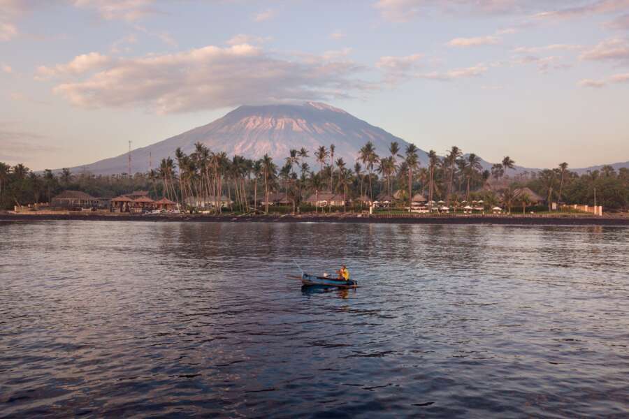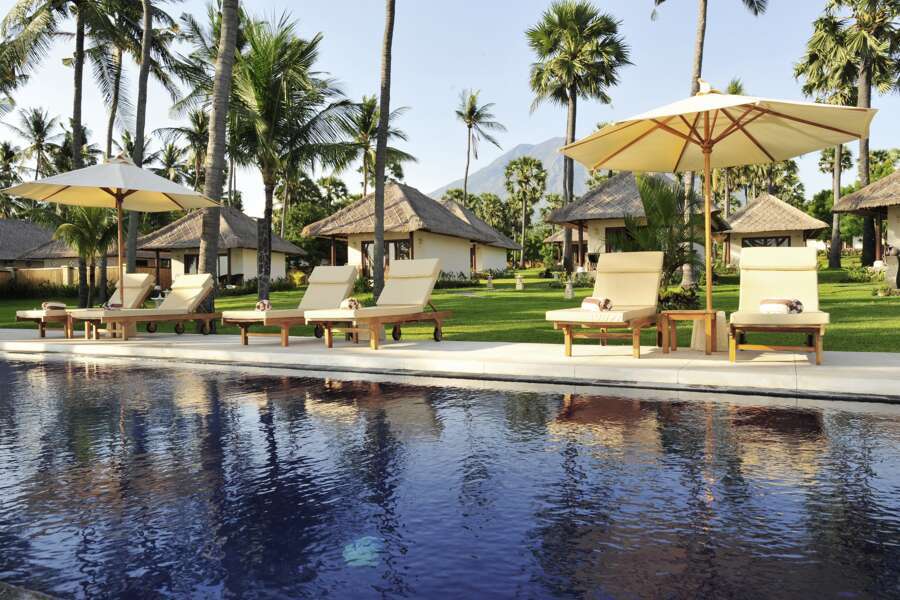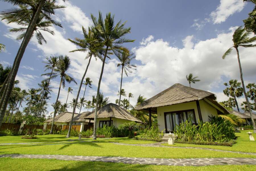 In einem idyllischen Palmenhain am Meer, nahe der Ortschaft Kubu. Tulamben und weitere Top-Tauchreviere im Nordosten von Bali befinden sich in unmittelbarer Umgebung.