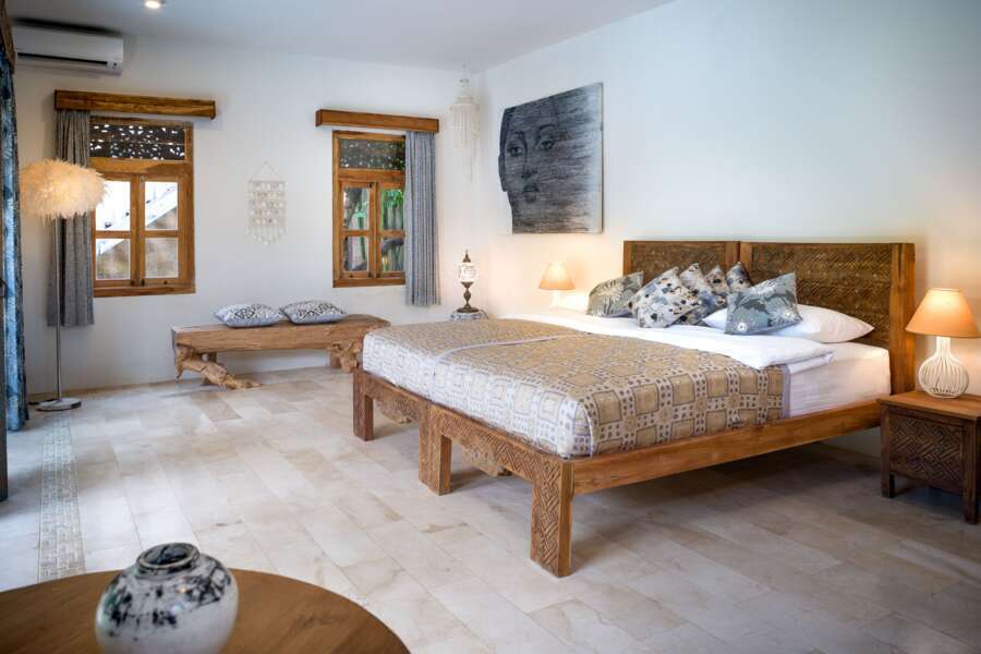 Die 3 Deluxe Zimmer (50m²) liegen im Erdgeschoss und sind unterteilt in das «Palm» und «Atlantis» Zimmer mit halboffenem Badezimmer und das «Dragon» Zimmer mit geschloßenem Bad/WC.