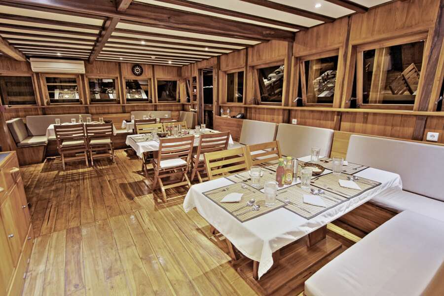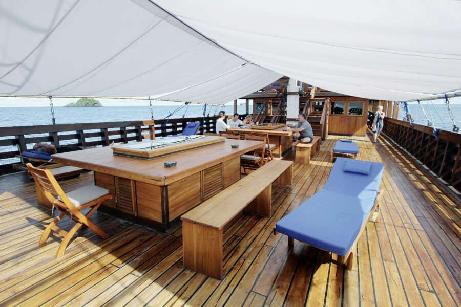 Ein wohldurchdachtes Konzept und das großzügige Platzangebot gestalten das Leben an Bord überaus komfortabel. Das Restaurant und die Lounge mit TV und DVD sind großzügig gestaltet. In der Computerecke stehen CD- und DVD-Brenner zur Nachbearbeitung und Sicherung von Fotos zur Verfügung. Das riesige Sonnendeck mit Liegen und Schattendach für heiße Tage lädt zum Sonnenbaden und Relaxen ein. Neben dem überdachten Tauchdeck befindet sich der Kameraraum mit großer Werkbank und Ladestationen.