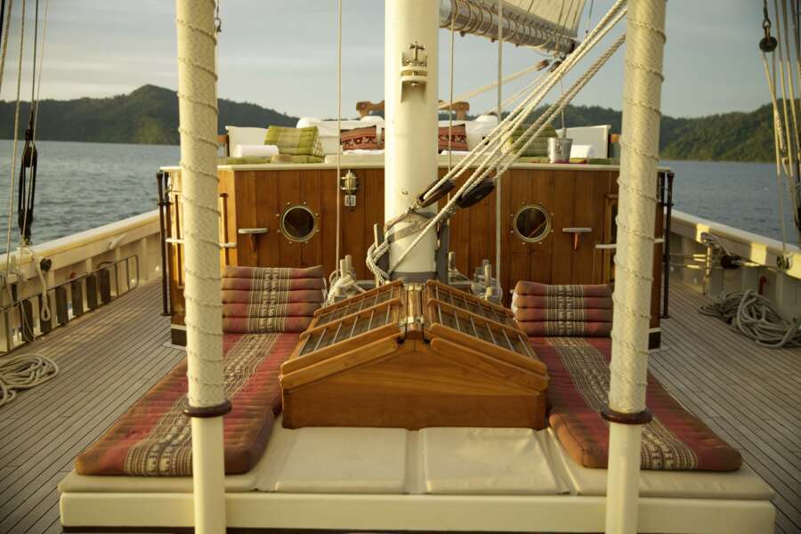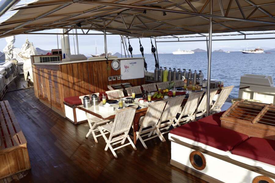 Raja Laut bedeutet «König der Meere» und man fühlt sich wahrlich wie ein König, wenn man die Indonesischen Gewässer an Bord des kleinen, familiären Phinisi-Schoners erforscht und betaucht. 12 Gäste kommen bequem in den 6 Kabinen unter. Das Essen wird am großen Tisch an Deck unter dem Sternenhimmel eingenommen wo man den Tag mit Relaxen verbringen kann.