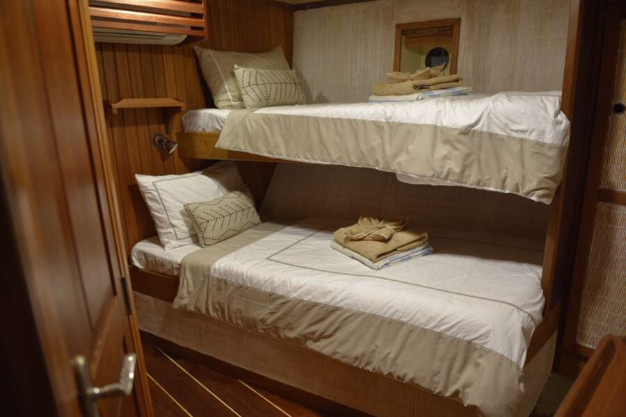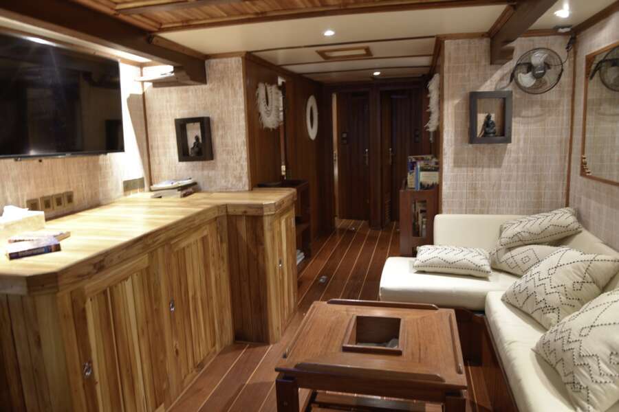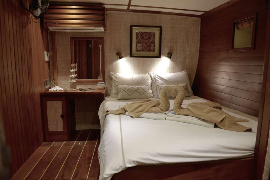 Die schöne Holz-Yacht bietet Platz für insgesamt 12 Taucher. Das Schiff umfasst 3 Kabinen mit Etagenbett sowie 3 Kabinen mit Doppelbett im Unterdeck. Alle Kabinen sind mit Klimaanlage, Ventilator und Safe ausgestattet und haben ein eigenes Bad mit Warmwasser, Dusche und WC.