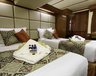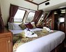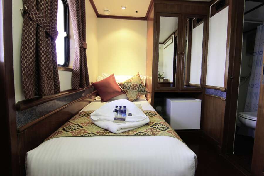 Die Masterkabine mit Doppelbett befindet sich auf dem Oberdeck, 4 Deluxe-Kabinen (Doppel- und Einzelbetten) auf dem Hauptdeck. Beide Kategorien mit Panoramafenster. 2 Budget Kabinen im Unterdeck mit Etagenbetten ohne Außenfenster. Alle Kabinen mit eigenem Bad und TV/DVD.