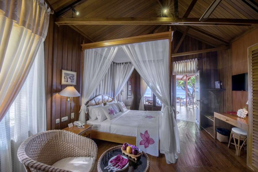 Die 18 Superior Minahasa Bungalows Gästezimmer sind eingerichtet mit Dusche und WC, Klimaanlage, Ventilator, TV, Minibar, Tee-/Kaffeemaschine und einer privaten Veranda mit Meersicht und Sitzgelegenheiten.