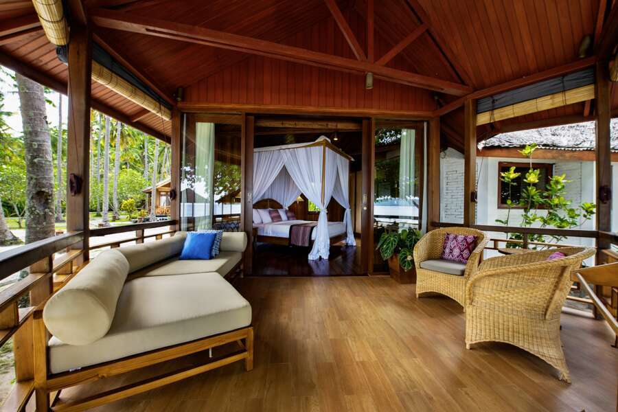 Die 12 Deluxe Minahasa Bungalows verfügen über dieselbe Ausstattung und haben zusätzlich eine Regendusche und ein Tagesbett auf der Veranda.