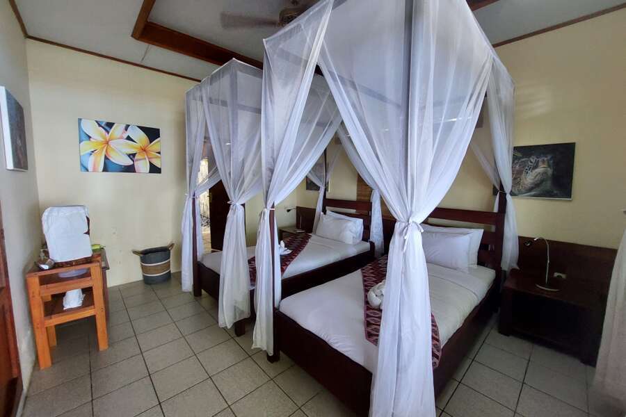 Die insgesamt 16 Bungalows verteilen sich in der gesamten Anlage und liegen durch die üppige Vegetation etwas versteckt. Die Zimmer bieten genügend Platz und sind zweckmäßig eingerichtet. Zur Ausstattung gehören jeweils ein Bad mit Dusche/WC, Klimaanlage, Wasserspender, Tee-/Kaffeekocher und kostenloses Wi-Fi.