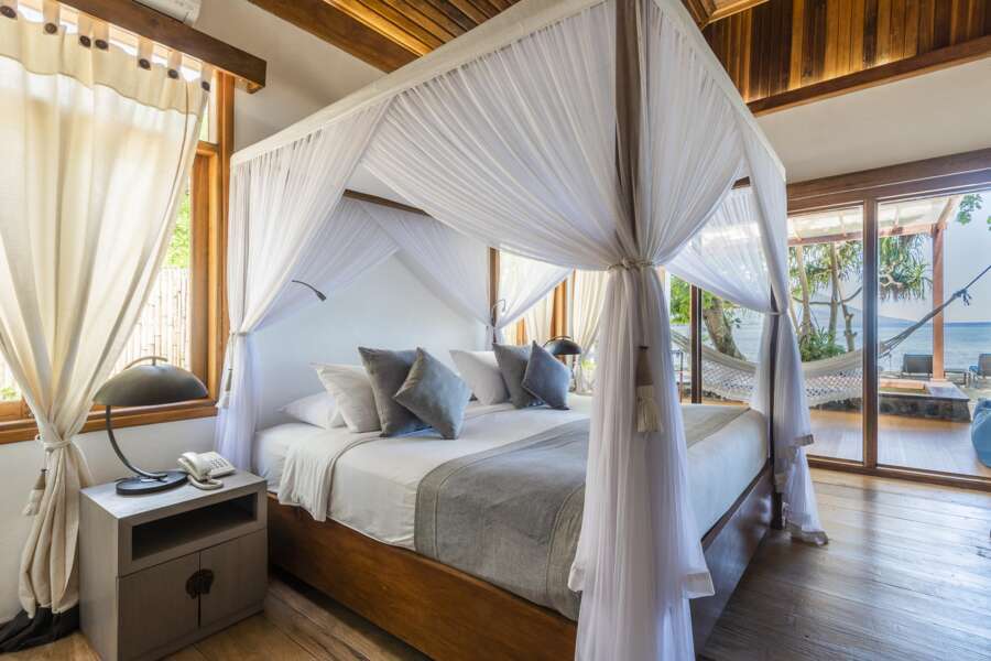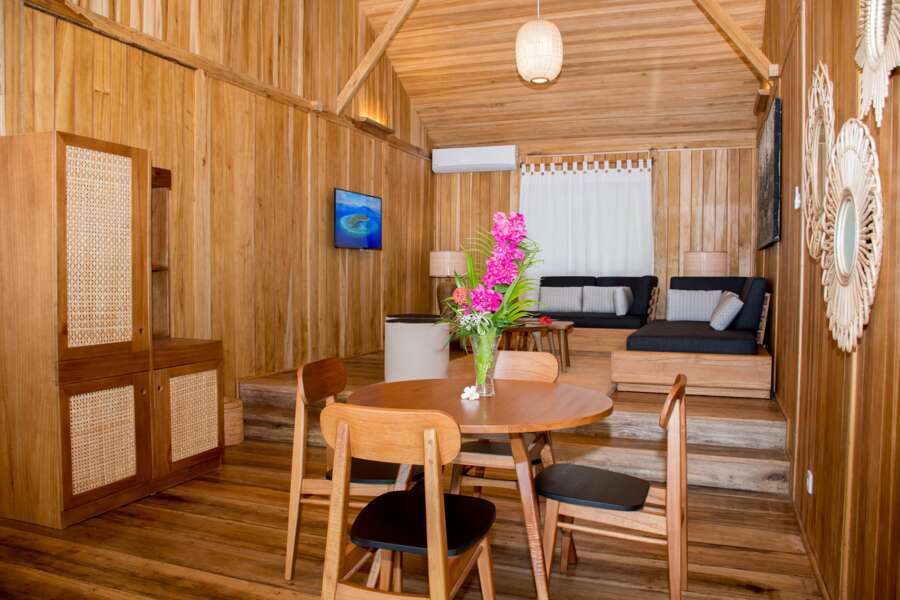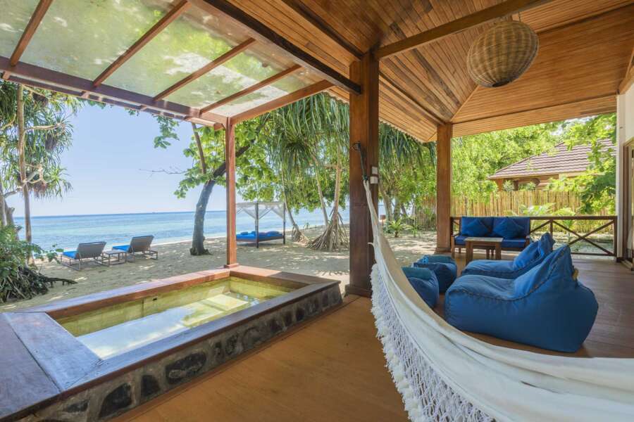6 Beach View Villen sind etwas geräumiger und bieten zusätzlich 2 Sonnenliegen auf der Veranda sowie einen schönen Blick aufs Meer.