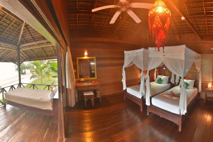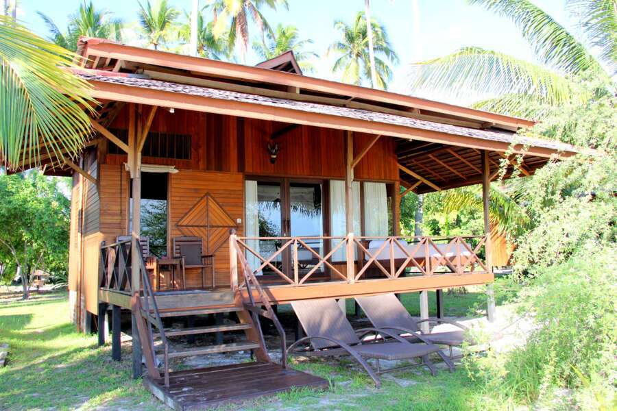20 Bungalows und 2 Beach End Bungalows liegen unter schattenspendenden Palmen direkt am Strand. Sie sind aus lokalen Hölzern gefertigt und bieten dem Gast viel Platz. Sie sind ausgestattet mit Klimaanlage, Ventilator, Safe, Minibar und Moskitonetz. Auch die schönen, offenen Badezimmer und eine große, möblierte Terrasse lassen keine Wünsche offen. Die Bungalows werden mit Solarenergie versorgt. Die beiden Beach End Bungalows liegen am Ende des Strandes und sind am weitesten entfernt von Tauchcenter und Restaurant.
