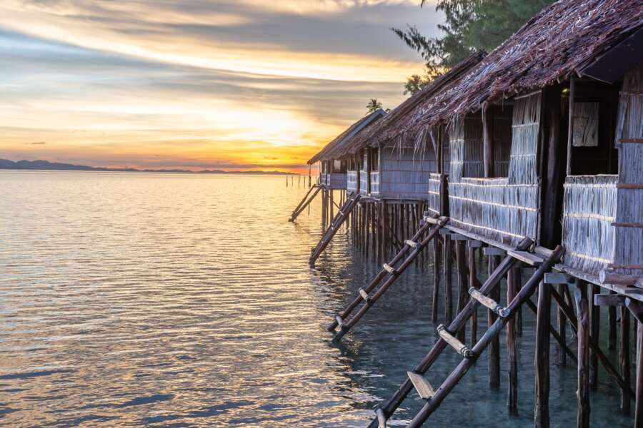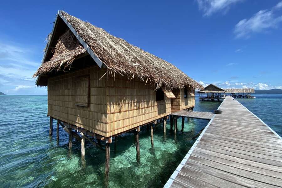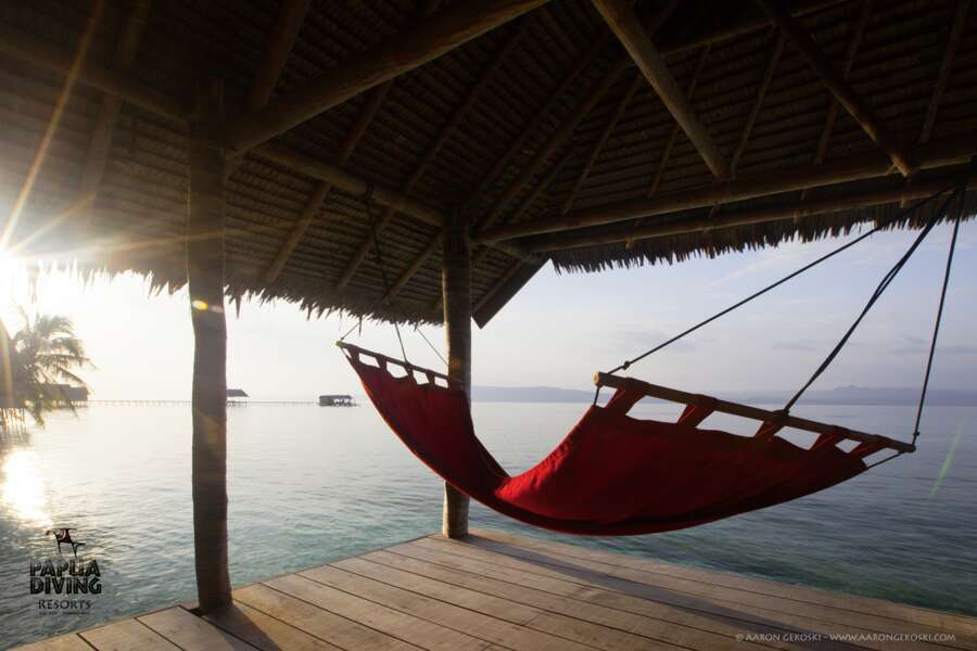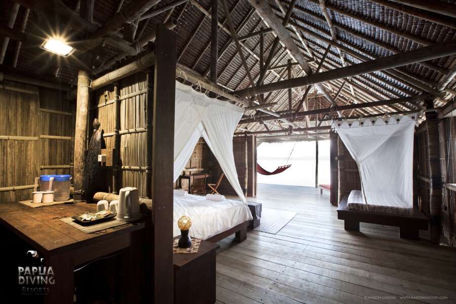 Die 2 Papuan Water Cottages liegen am Hauptjetty und verfügen über ein Doppelbett oder zwei Einzelbetten, sowie eine kleine Veranda mit Hängematte und Sitzmöglichkeiten.