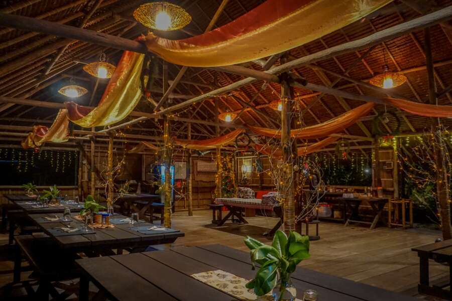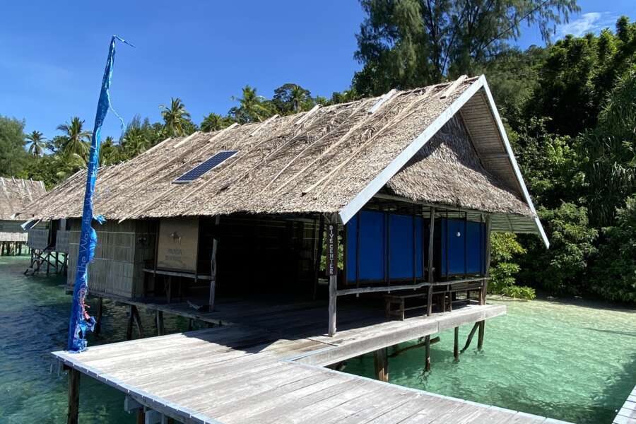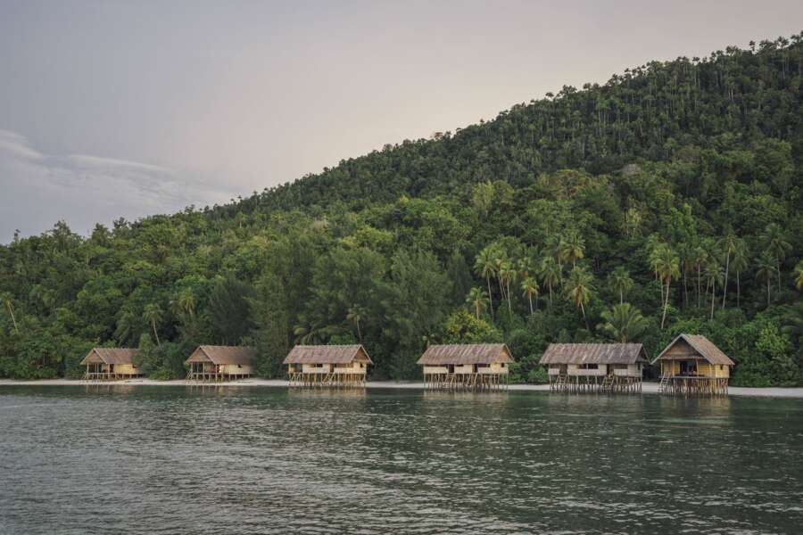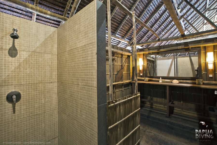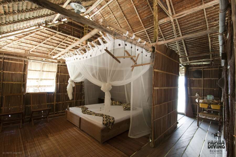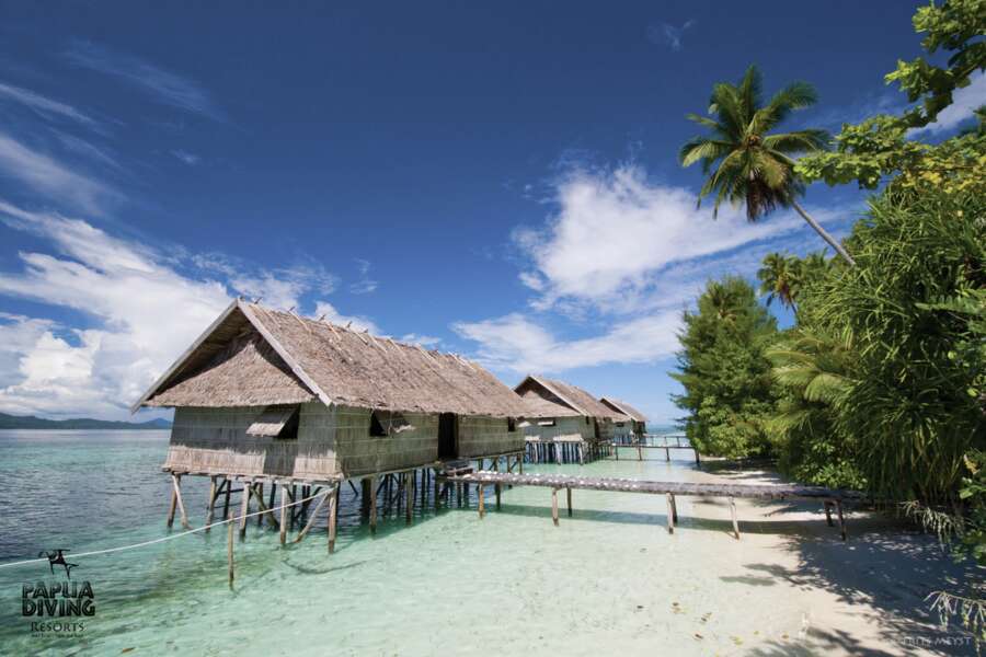 Landestypische Hütten wurden in traditioneller Weise über dem Meer erbaut. So liegen auch das offene Restaurant und die Küche auf Stelzen über dem Strand. An Land befinden sich die Sanitäranlagen für die Papuan- und Superior Water Cottages, bestehend aus 6 Gemeinschaftsbädern mit westlichen Duschen und Toiletten. Ansonsten finden sich an Land nur Lagerräume, Kompressoren und die Wasseraufbereitungsanlage. Wi-Fi steht im Hauptbereich des Resorts zur Verfügung.