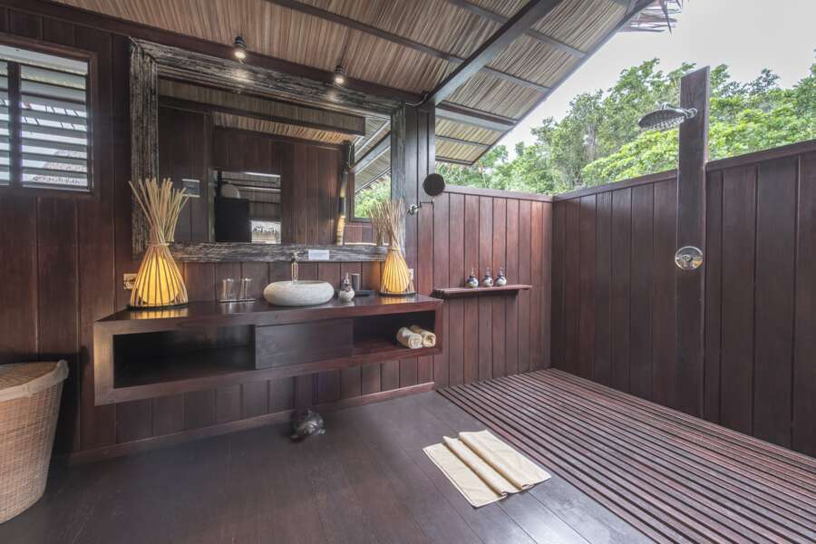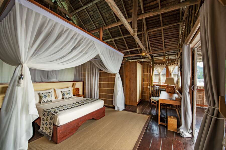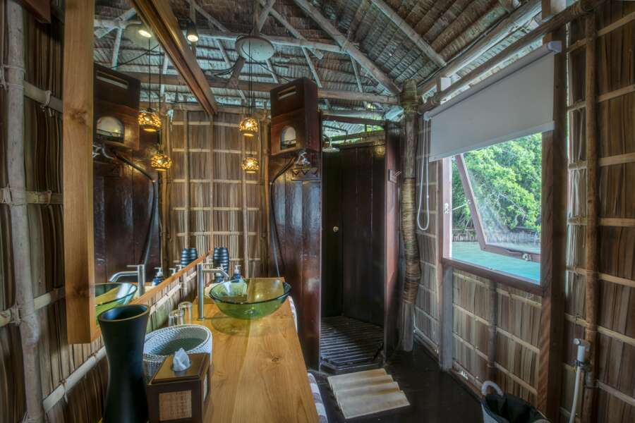 Die große Veranda ist jeweils mit Liegebetten, Tisch, Stühlen und Hängematte ausgestattet. Je nachdem lässt sich der eine oder andere Riffbewohner direkt von der Terrasse aus bestaunen. Bewusst wurde in den Zimmern auf eine Klimaanlage verzichtet; ein Ventilator gehört jedoch zur Grundausstattung. Durch die lokale Bauweise sind die Temperaturen in den Zimmern angenehm. Tee-/Kaffee-Kochmöglichkeiten stehen kostenlos zur Verfügung. Zur weiteren Ausstattung gehören ein Safe, ein Moskitonetz und ein Schreibtisch.