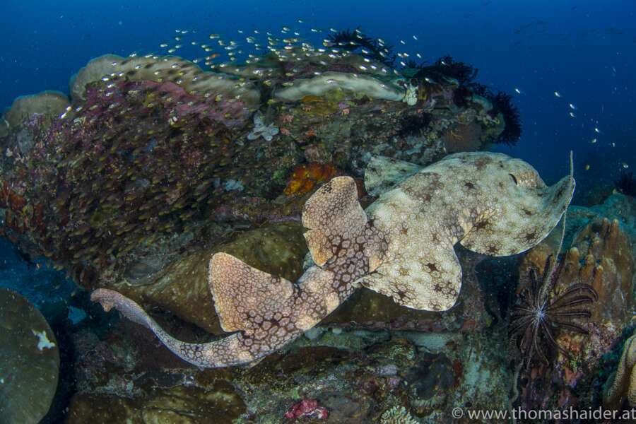 Tauchrevier Das Tauchrevier wird in «local dives» und «far dives» unterteilt. Die «local dives» schließen die Tauchplätze der Region mit ein, welche in ca. 20–25 Minuten per Boot erreichbar sind. Auch die Top-Spots wie Kri sowie Mansuar Island zählen dazu, die Anfahrt dauert jedoch rund 45 Minuten per Boot. Zu den «far dives» gehören die Highlights wie Fam und Passage, welche in knapp 90 Bootminuten angefahren werden. Egal ob schwindelerregende Steilwände, farbenprächtige Korallengärten oder atemberaubende Überhänge – all das erfreut Taucher in Raja Ampat täglich. Diverse Raritäten im Makrobereich, aber auch Mantas und andere Großfische sind hier im abgelegenen West-Papua heimisch.