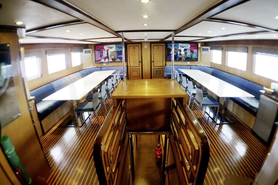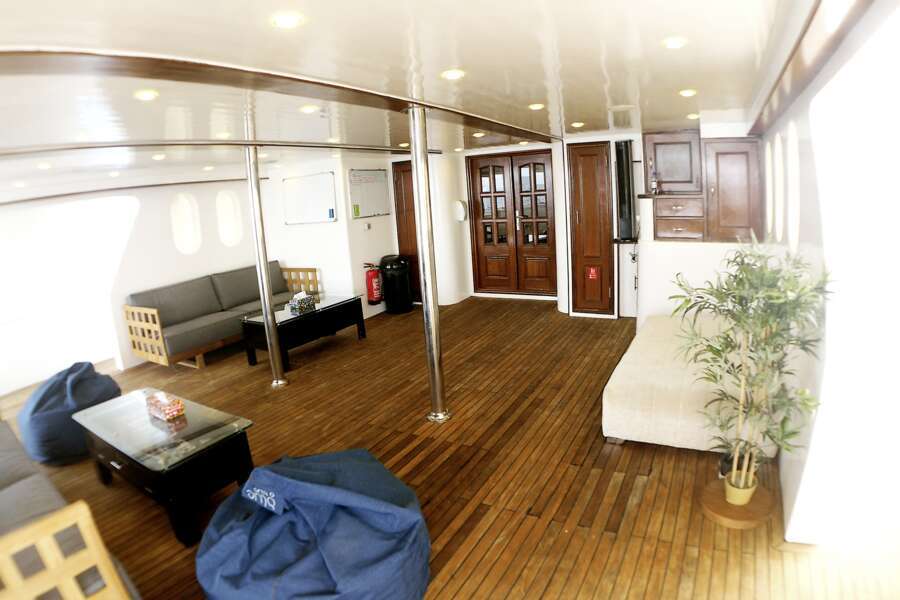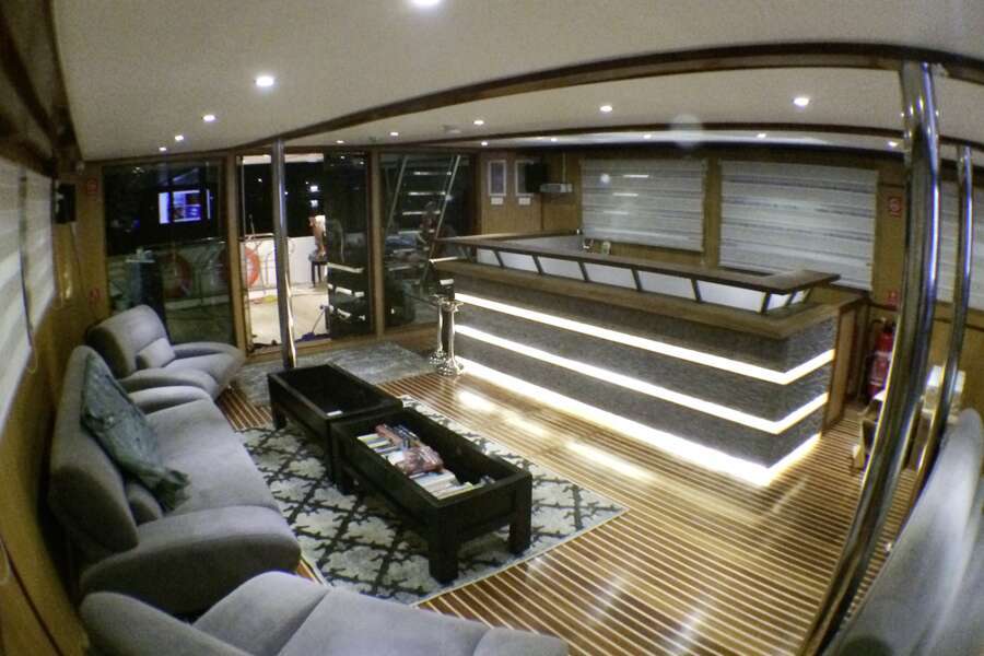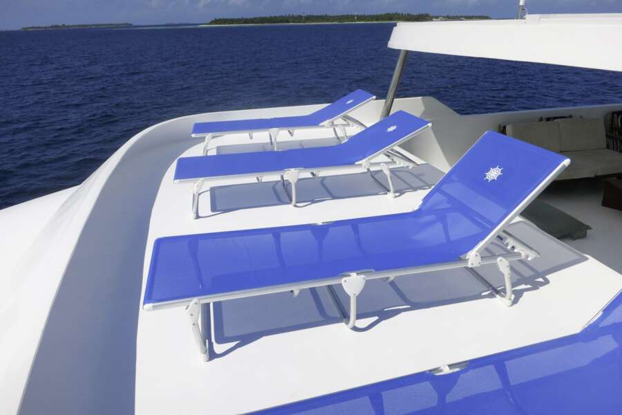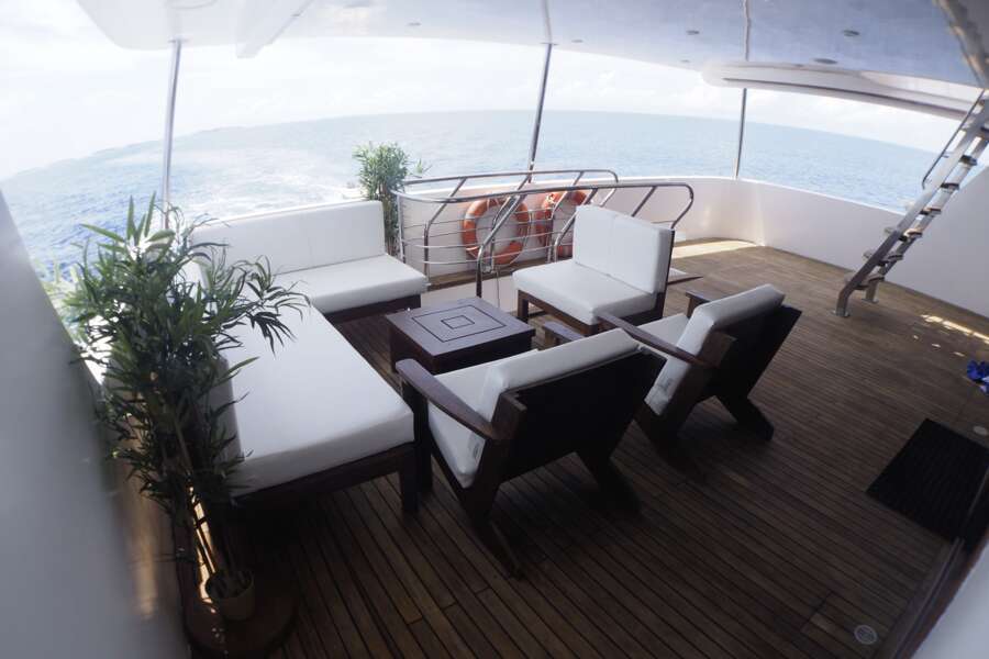 Auf dem Hauptdeck hat es einen klimatisierten Essbereich und eine Sitzecke im Außenbereich. Im Oberdeck befinden sich Indoor-Lounge und Bar, Jacuzzi und Liegen auf dem Sonnendeck. Gratis Wi-Fi (250 MB). Begleitung durch 1 Tauch-Dhoni, Tauchausrüstung bleibt während dem Törn auf dem Dhoni.