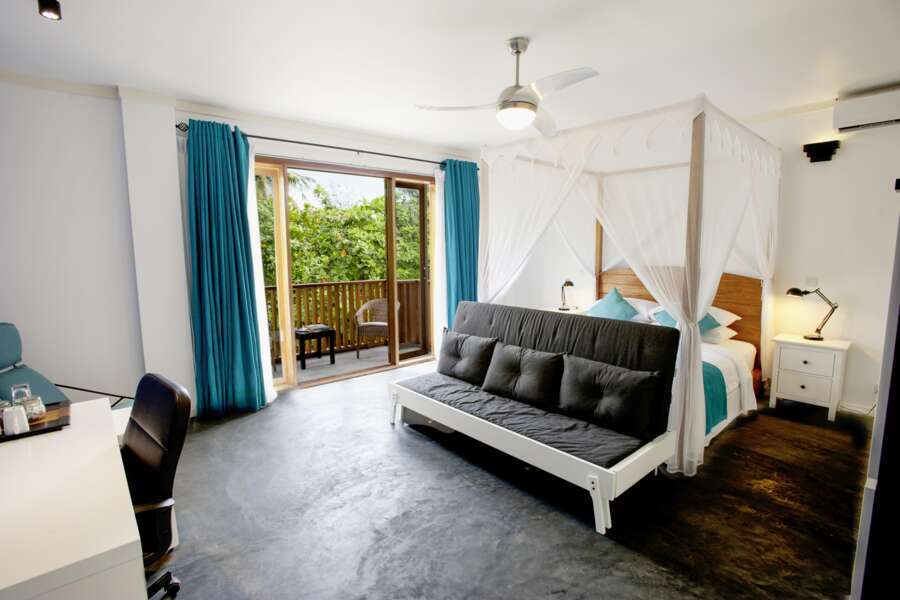 Alle 6 Zimmer befinden sich im Haupthaus und sind gemütlich eingerichtet. Sie verfügen über eine Klimaanlage und Deckenventilator, Safe, ein maledivisches Badezimmer und einen Balkon. Besondere Extras wie ein Kameraarbeitsplatz mit USB-Ladestelle und Rotlicht sind zudem vorhanden.