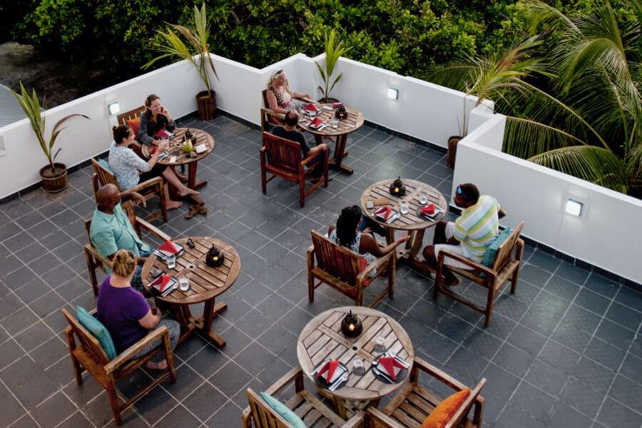 Das Hotel bietet ein Hauptrestaurant im Buffetstil mit internationaler Küche, das zweite Restaurant befindet sich auf der Dachterrasse. Getränkeecke, Sonnenterrasse, In-House-Projektor zum gemeinsamen Betrachten von Videos und Fotos, kostenloses Wi-Fi im ganzen Hotel, gelegentlich Livemusik, medizinisches Fachpersonal auf der Insel.