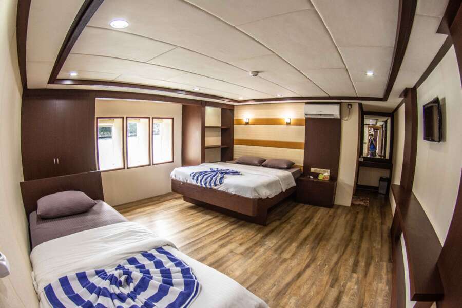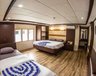 Die 8 Standard Kabinen im Unterdeck sind klimatisiert (individuell regulierbar), verfügen über jeweils 2 Einzel- oder Doppelbetten sowie Dusche/WC, Haartrockner, TV. Die 2 Suiten auf dem Hauptdeck und 3 weiteren auf dem Oberdeck sind mit 1 Doppelbett sowie 1 Einzelbett ausgestattet.