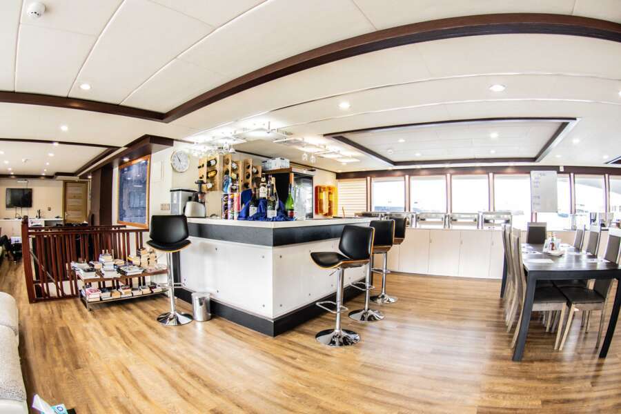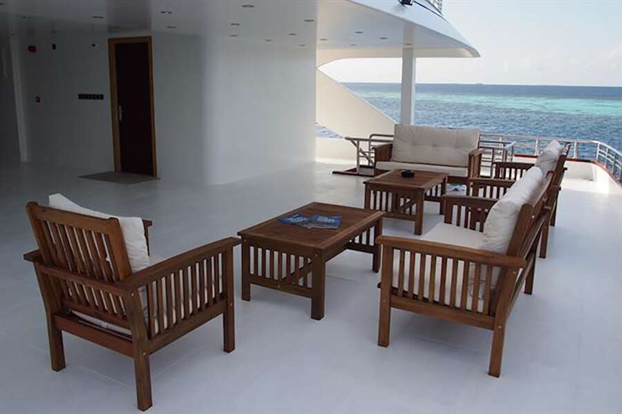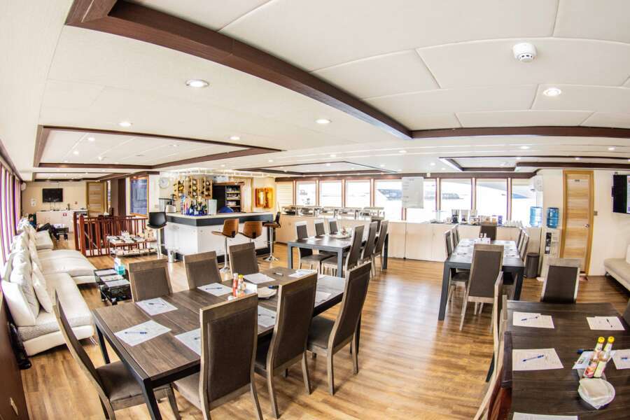 Klimatisierter Aufenthaltsraum mit Essbereich, Sofaecke, TV, Bibliothek sowie Bar auf dem Hauptdeck. Lounge und klimatisierter Spa-Raum auf dem Oberdeck, Sonnendeck mit Liegestühlen. Begleitung durch 1 Tauch-Dhoni mit Ladestationen für Fotoausrüstung, Tauchausrüstung bleibt während dem Törn auf Dhoni.