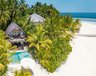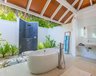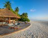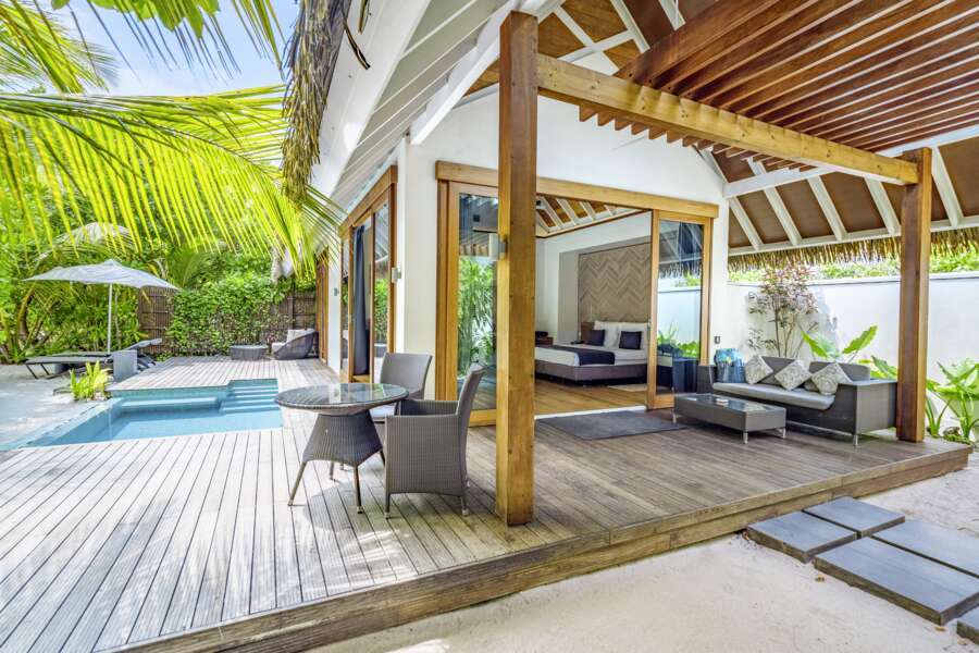 Die 6 Beach Villas (85 m²) liegen auf der Westseite der Insel und bieten ein großzügiges Open-Air-Badezimmer mit Whirlpool-Badewanne und Außendusche sowie Tagesbett auf der Veranda.