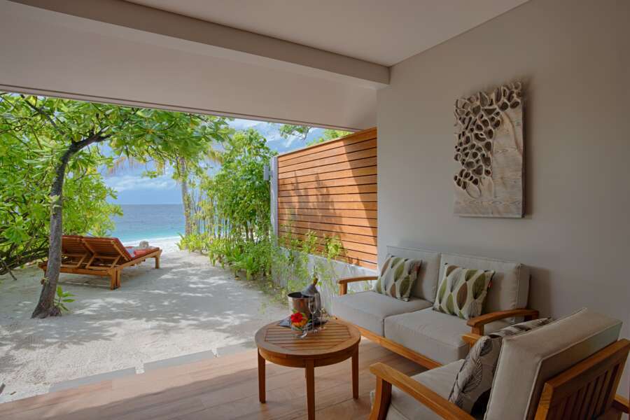 Die 56 Beach Villas (68 m²) sind in Doppeleinheiten aufgeteilt und verfügen über ein halboffenes, maledivisches Bad mit Jacuzzi-Badewanne und Dusche, Haartrockner, Klimaanlage, Deckenventilator, LCD-Fernseher, Telefon, Safe, Minibar, Nespresso-Maschine, ein Tagesbett sowie eine Sonnenterrasse.