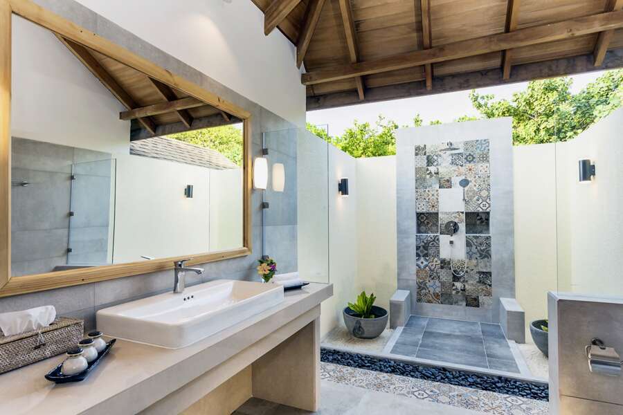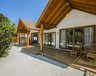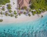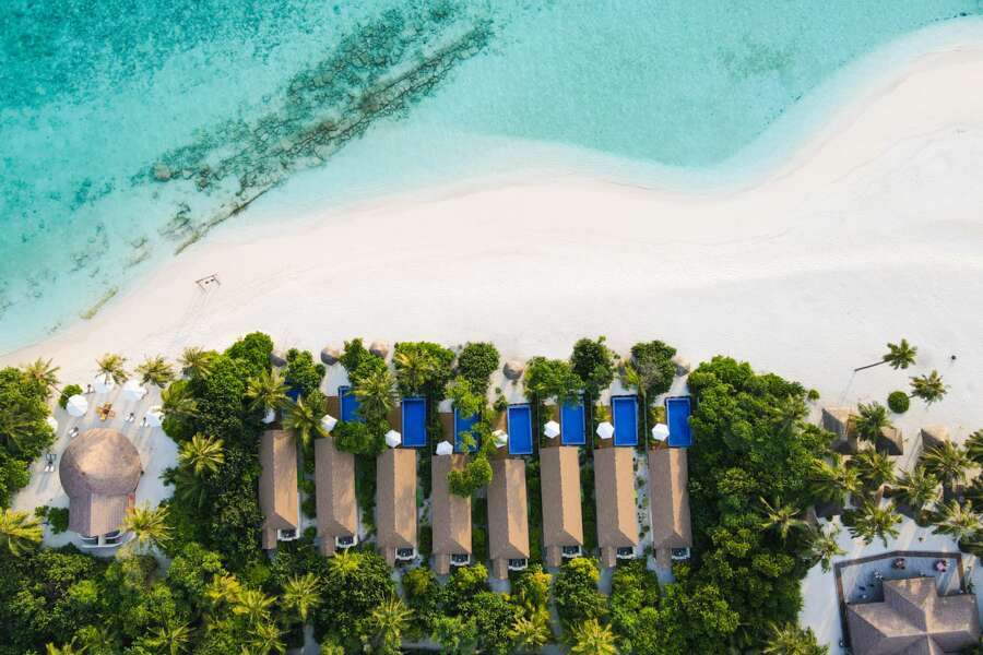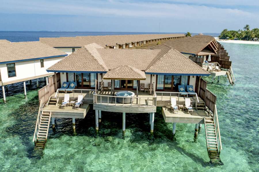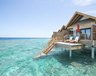 Die 44 Water Villas (78 m²) sind auf Stelzen in die Lagune gebaut und über einen Steg mit der Insel verbunden. Sie verfügen über eine großzügige Terrasse mit direktem Zugang zum Meer und ein halboffenes Badezimmer mit Badewanne und Außendusche.
