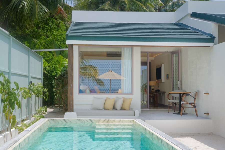 Die 26 Deluxe Beach Villas mit Pool (67 m², Pool 10 m²) sind ebenfalls zusammengebaut, etwas großzügiger und liegen überwiegend auf der Westseite der Insel am breiteren Strandabschnitt.