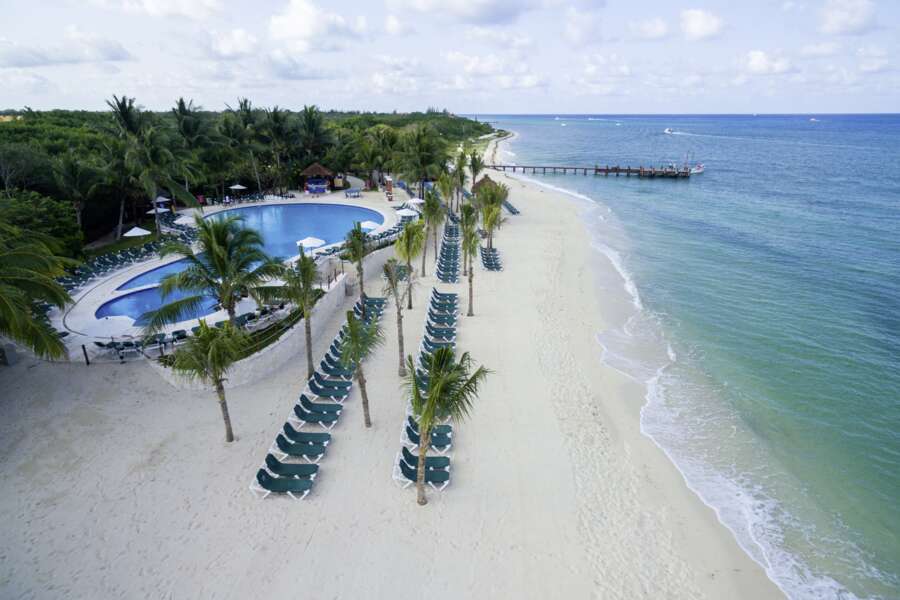 An einem weißen Sandstrand umgeben von Mangroven und üppiger grüner Vegetation befindet sich das Resort auf der Insel Cozumel.