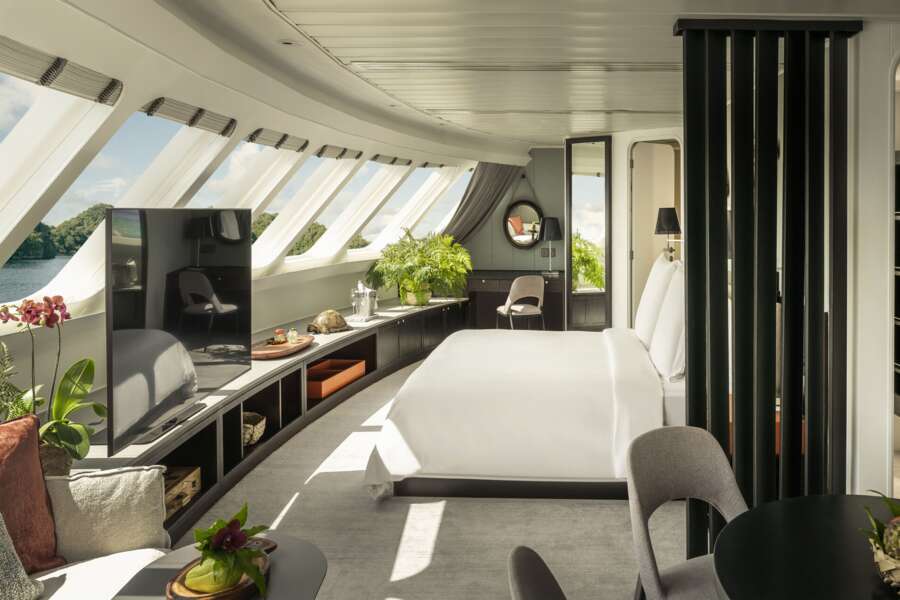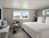 Die Explorer Suite auf dem Oberdeck (45 m²) hat zusätzlich eine riesige Fensterfront mit Panoramafenstern, eine Badewanne, ein gemütliches Sofa, einen Esstisch und ein privates Sonnendeck.