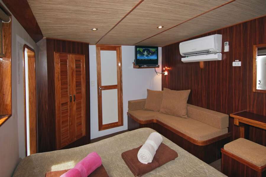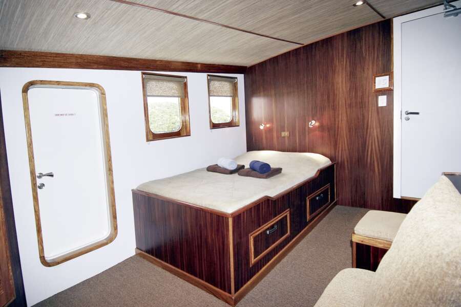 Je 3 Standard und Deluxe Kabinen im Unterdeck sowie 2 große Masterkabinen im Oberdeck bieten viel Platz für maximal 16 Taucher. Alle Kabinen verfügen über Klimaanlage, Dusche und WC.