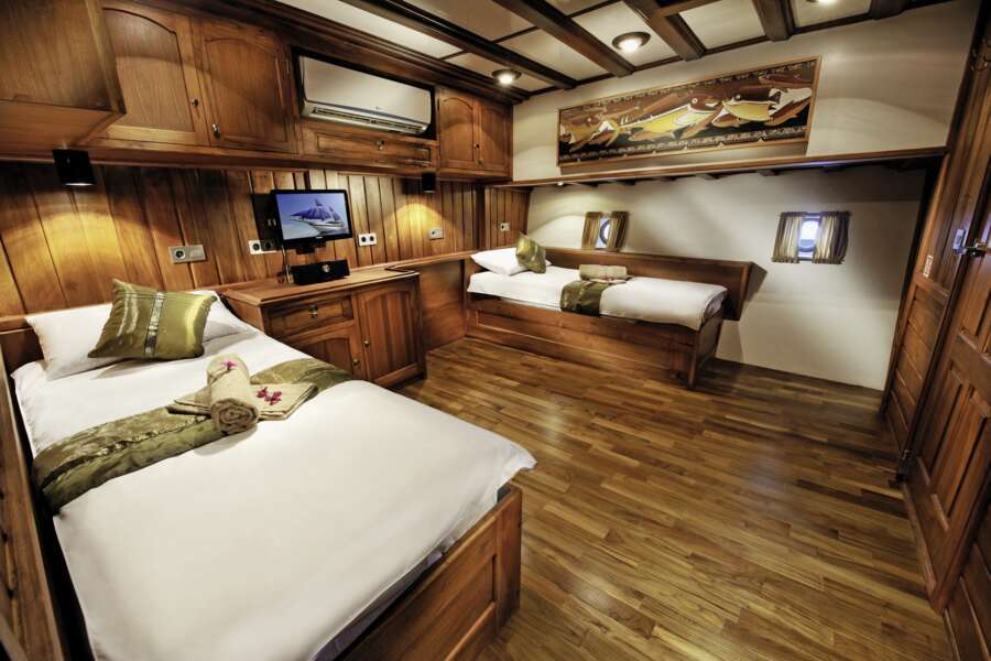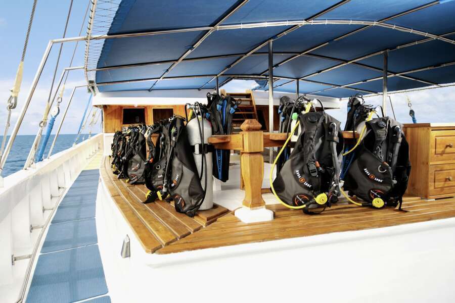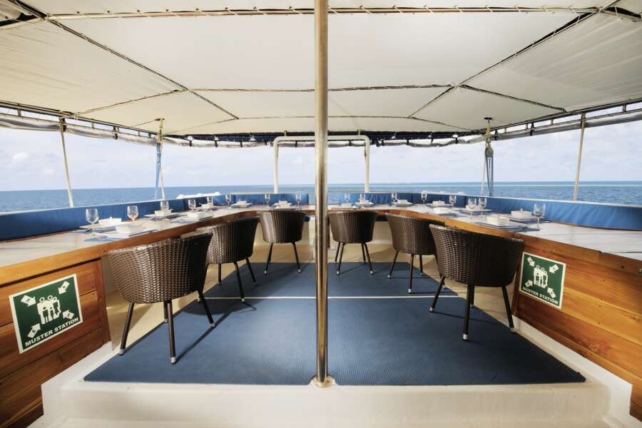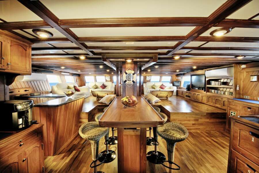 Selbst bei voller Belegung mit 16 Personen findet jeder Gast ausreichend Raum, um sich zwischen den Tauchgängen zu entspannen. Hierfür sind besonders das großzügige Sonnendeck und das beschattete Deck über dem Salon sehr geeignet. Der geräumige Salon ist klimatisiert und verfügt über TV/DVD/Hi-Fi und eine Bibliothek. Im hinteren, offenen Bereich des Schiffes werden die asiatisch und europäisch zubereiteten, sehr köstlichen Mahlzeiten eingenommen. Ebenso findet man einen großzügigen Speisesaal, einen Massageservice und sogar einen Wäscheservice sowie eine kleine Boutique an Bord.