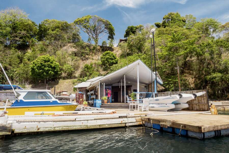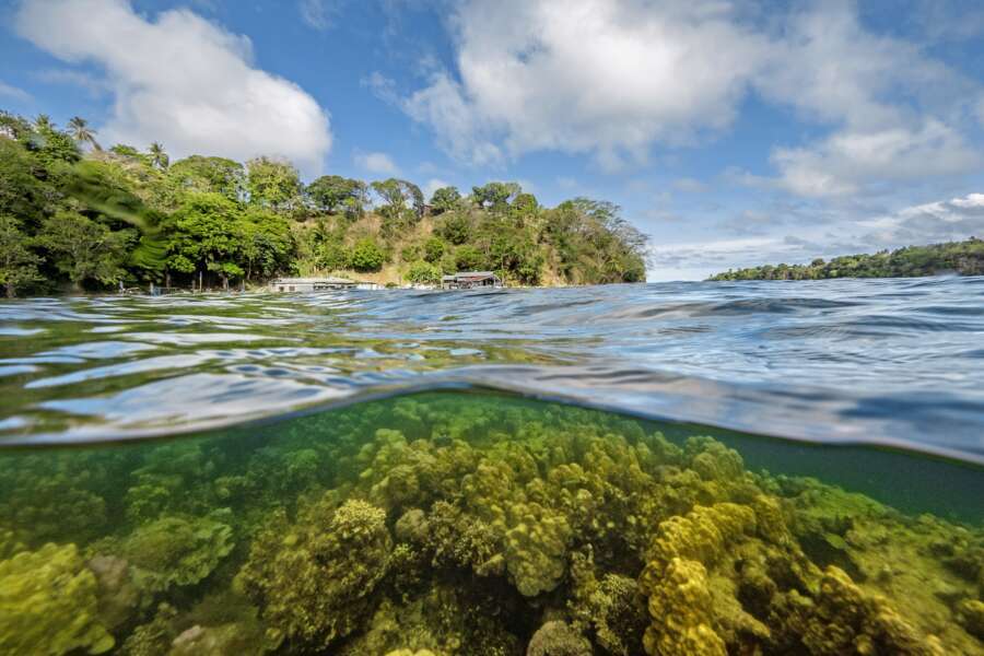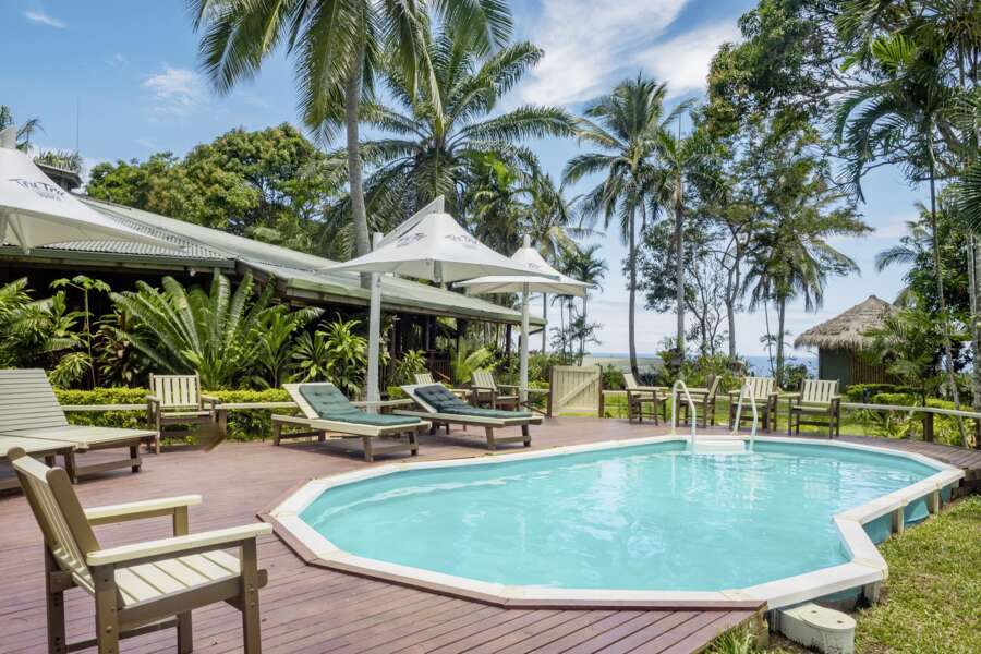 Auf der Hauptinsel, 250 Kilometer östlich von Port Moresby. Das Resort steht erhöht auf einer Klippe.