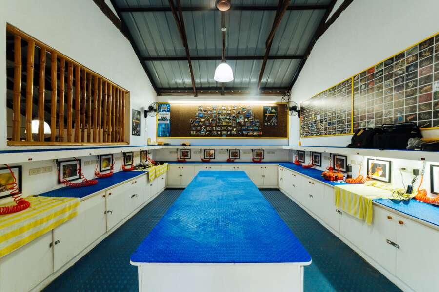 Infrastruktur Spülbecken, belüfteter Trockenraum, Dusche, WC sowie Schulungsraum mit TV. Großzügiger Kameraraum mit 18 Ladestationen, Schließfächer, Luftdruckpistolen und 4 zusätzliche Spülbecken nur für Unterwasserkameras. 3 Bangkas (Auslegerboote) für max. 10 Taucher plus Crew.
