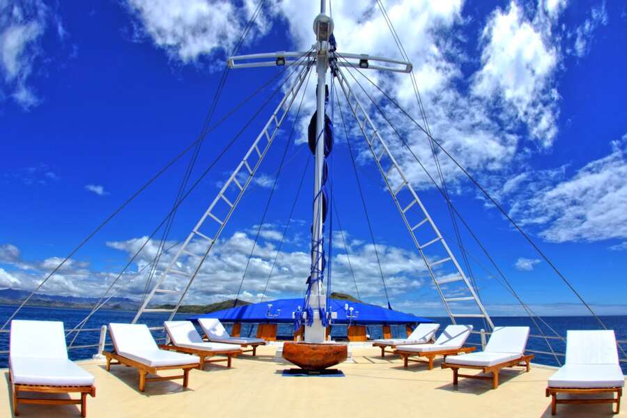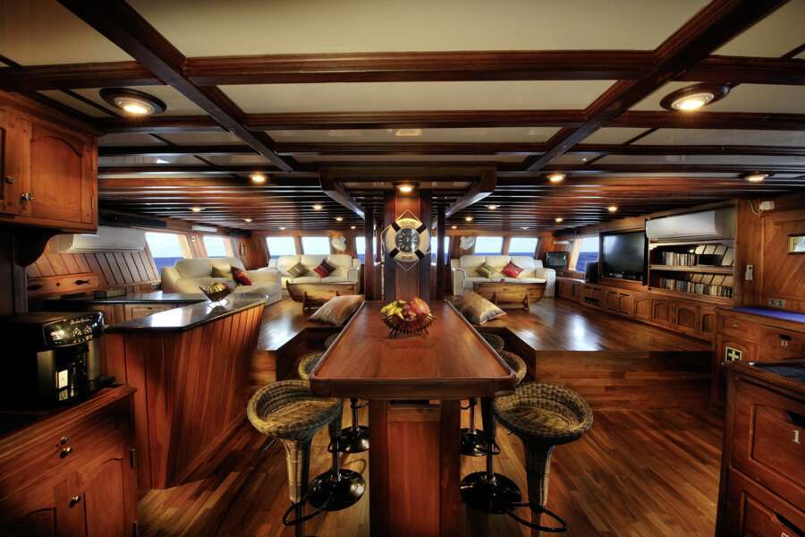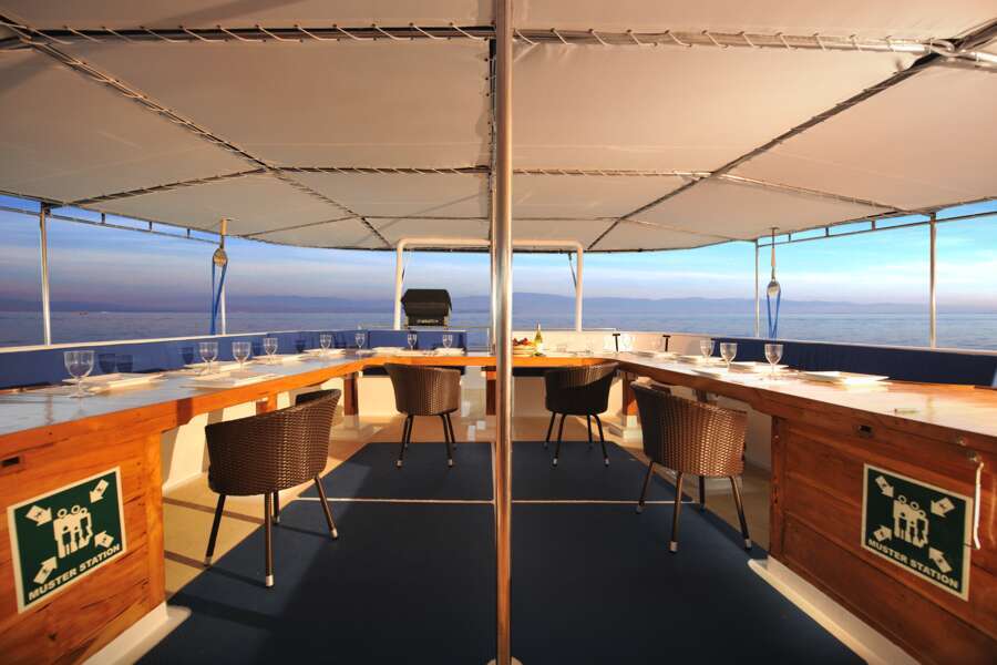 Selbst bei voller Belegung mit 16 Personen findet jeder Gast ausreichend Raum, um sich zwischen den Tauchgängen zu entspannen. Hierfür sind besonders das großzügige Sonnendeck und das beschattete Deck über dem Salon sehr geeignet. Der geräumige Salon ist klimatisiert und verfügt über TV/DVD/Hi-Fi und eine Bibliothek. Im hinteren, offenen Bereich des Schiffes werden die asiatisch und europäisch zubereiteten, sehr köstlichen Mahlzeiten eingenommen. Ebenso findet man einen großzügigen Speisesaal, einen Massageservice und sogar einen Wäscheservice sowie eine kleine Boutique an Bord.