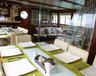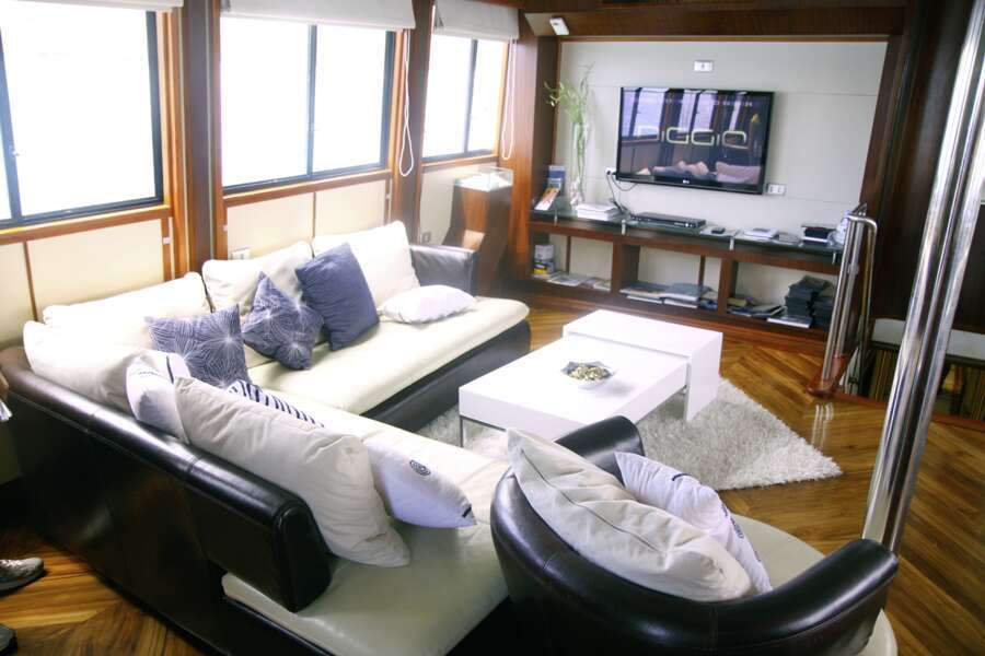 Der Aufenthalts- und Essbereich, die Lounge mit TV/DVD/CD, Bibliothek und Bar sind elegant mit viel Teakholz ausgekleidet. Das großzügige Sonnendeck bietet auch Schattenplätze und einen Whirlpool. Große Tauchplattform mit Kameratischen, Spülbecken und Stauraum.