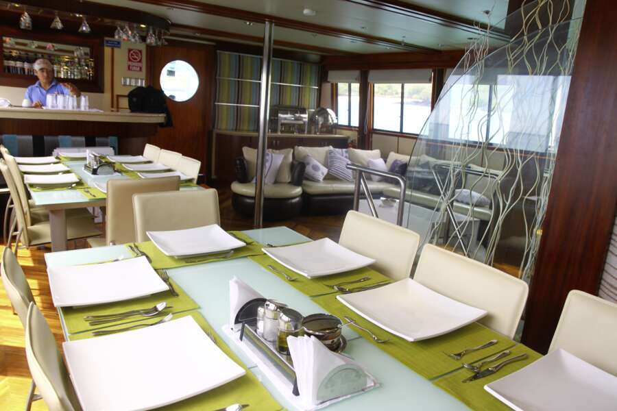 Die Mahlzeiten an Bord sind abwechslungsreich und reichhaltig mit frischen tropischen Früchten, lokale und internationale Küche. Zwischen den Mahlzeiten werden Snacks serviert.